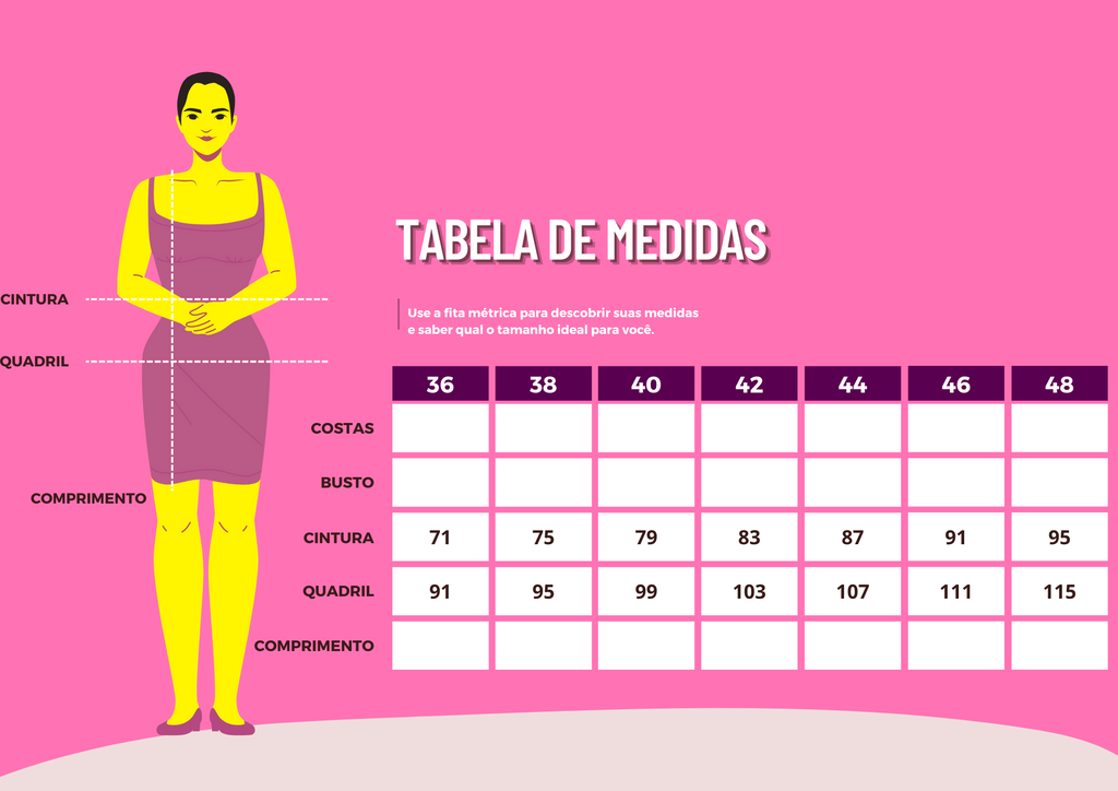 Tamanho 36: Cintura 71 cm / Quadril 91 cm / Comprimento 29 cm